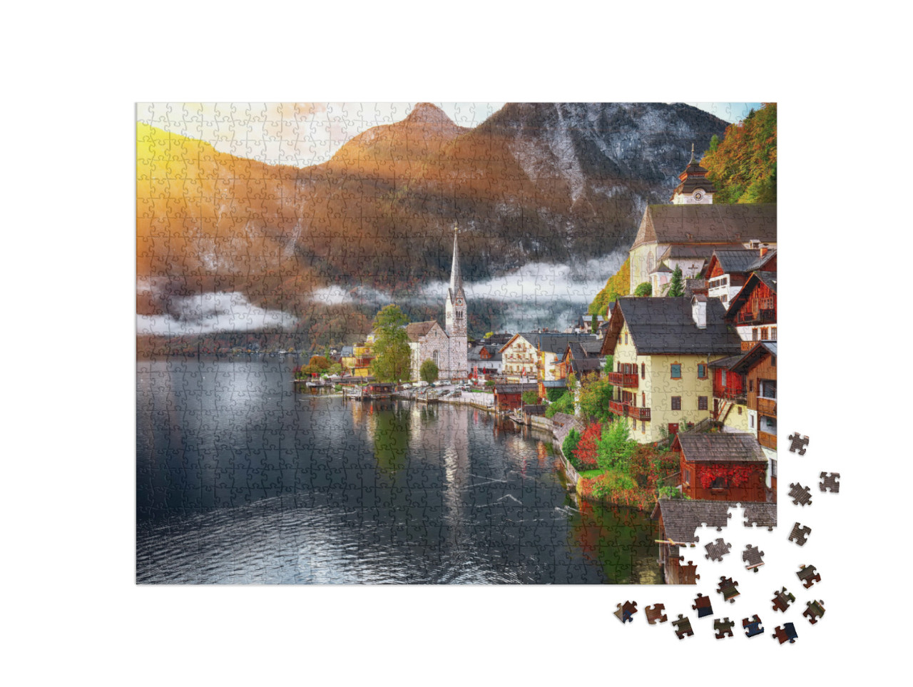 puzzle „Horská vesnice Hallstatt s Hallstattským jezerem, Alpy, Rakousko“
