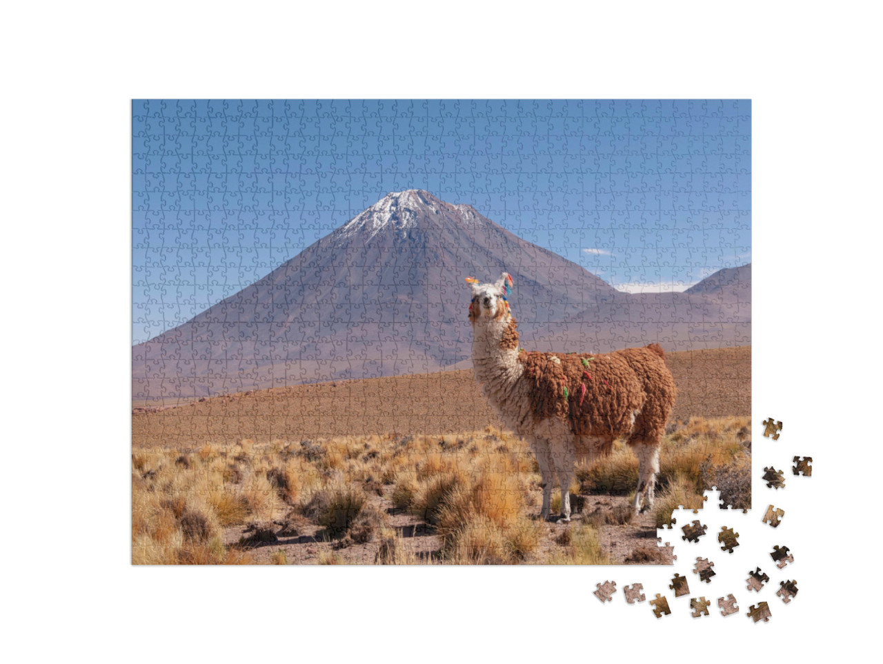 puzzle „Lama, za ním sopka Licancabur na hranici mezi Bolívií a Chile.“