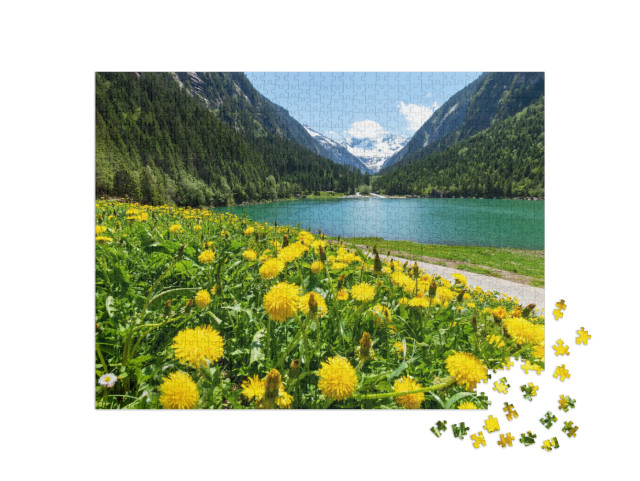 puzzle „Léto v Tyrolských Alpách: Pampeliška a horské jezero, Zillertal, Rakousko“