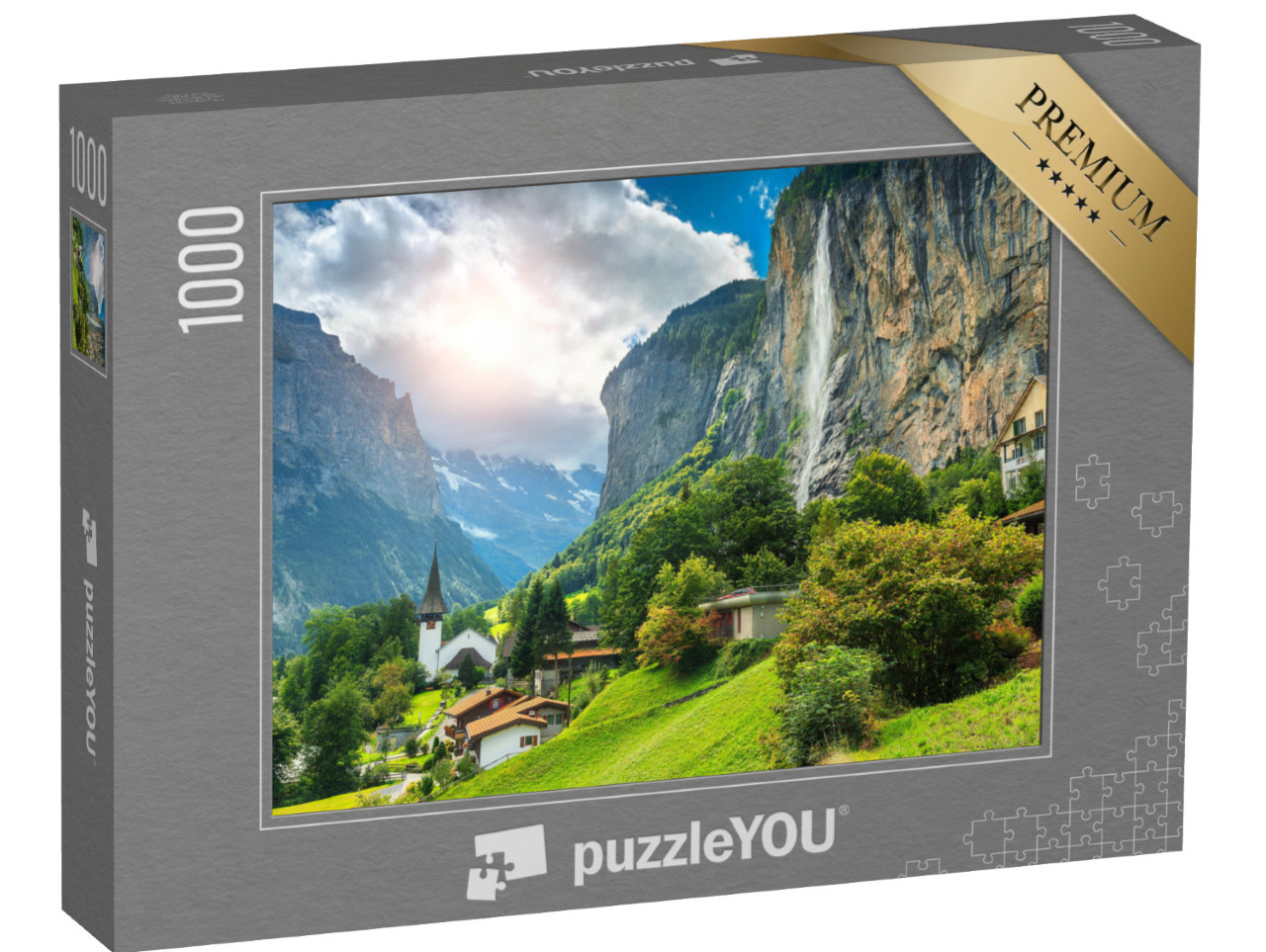 puzzle „Malebná alpská vesnice s vodopádem Staubbach, Lauterbrunnen, Švýcarsko“