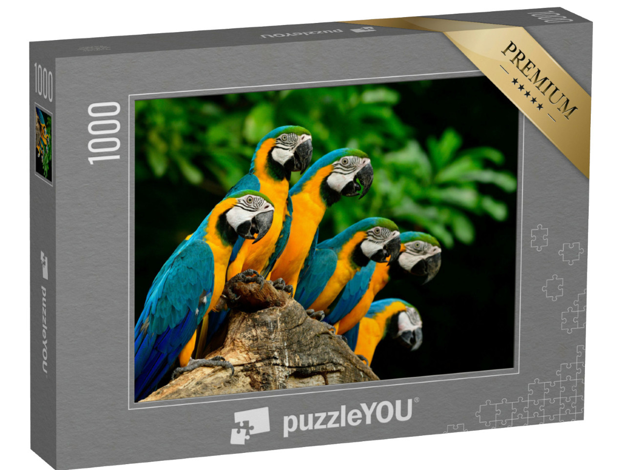 puzzle „Mnoho modrých a žlutých nebo modrých a zlatých makaků na kmeni stromu“
