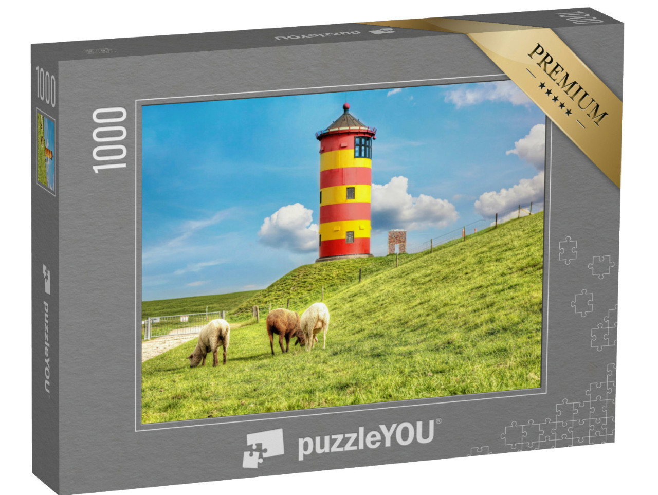 puzzle „Ovce před majákem Pilsum na německém pobřeží Severního moře“