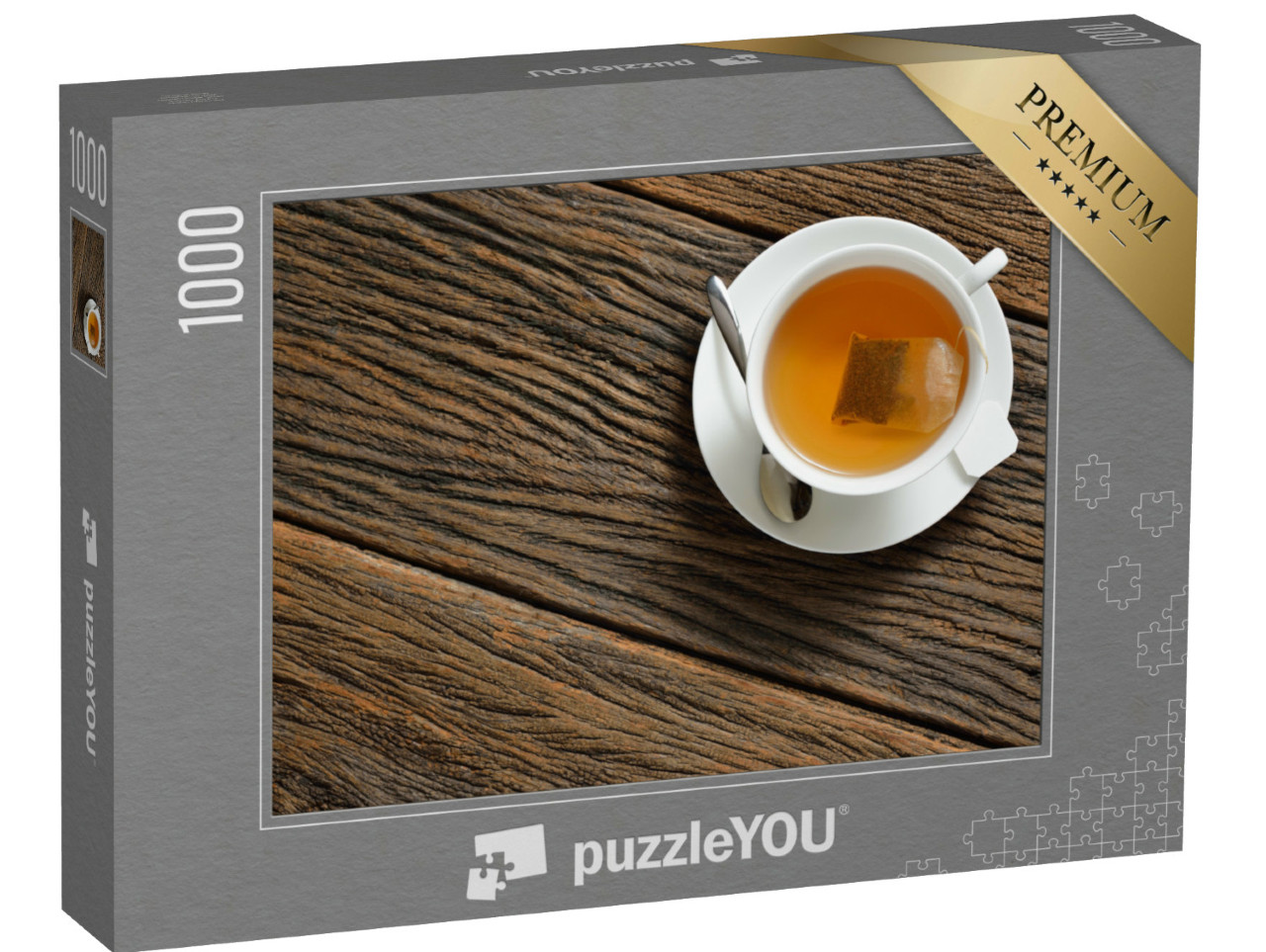 puzzle „Pohled shora na šálek čaje s čajovým sáčkem na dřevěném stole...“