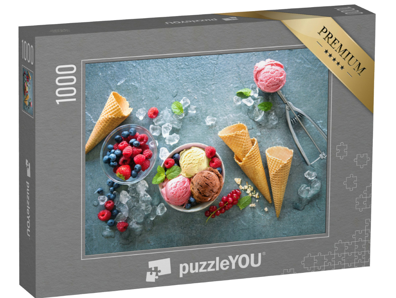 puzzle „Různé druhy zmrzliny v misce s mátou, bobulemi“