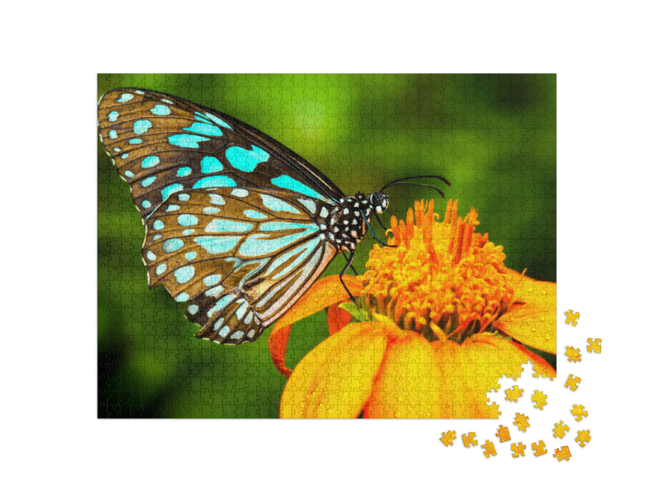 puzzle „Výjev z přírody: modrý motýl na žlutém květu“