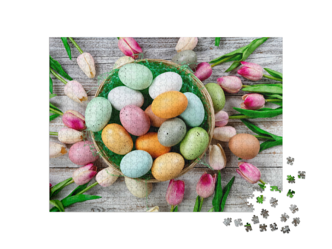 puzzle „Barevná velikonoční vajíčka v hnízdě s tulipány“