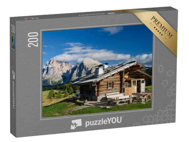 puzzle 200 dílků „Chata na Seiser Alm s Plattkofelem a Langkofelem, Jižní Tyrolsko“